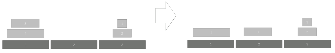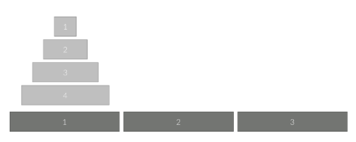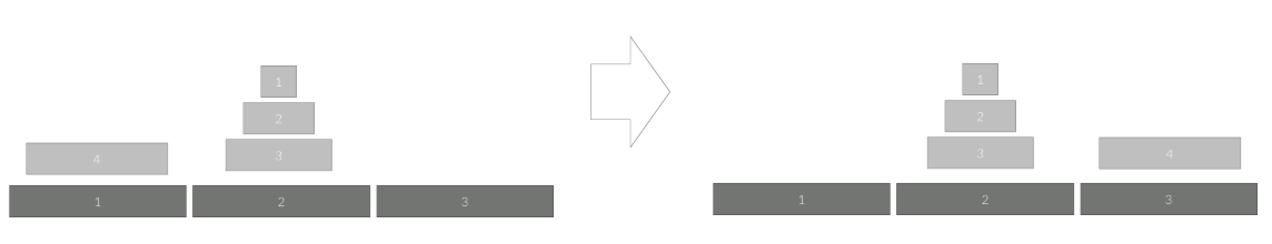 먼저 4개의 원판을 전부 3위치에 옮겨 놓기 위해서는 아래처럼 2번 위치에 1번, 2번, 3번 원판이 위치해 있어야한다.