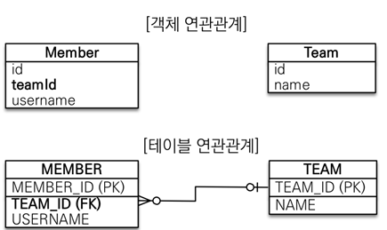 관계형 DB의 경우에서 위 예시를 매핑하기 위해서는 아래와 같이 MEMBER 테이블에서는 외래 키를 가지고 있어야 한다. 그래서 이러한 구조를 그대로 객체로 옮겨오게 되면 Member Entity에는 teamId를 가지고 있어야 하는데,